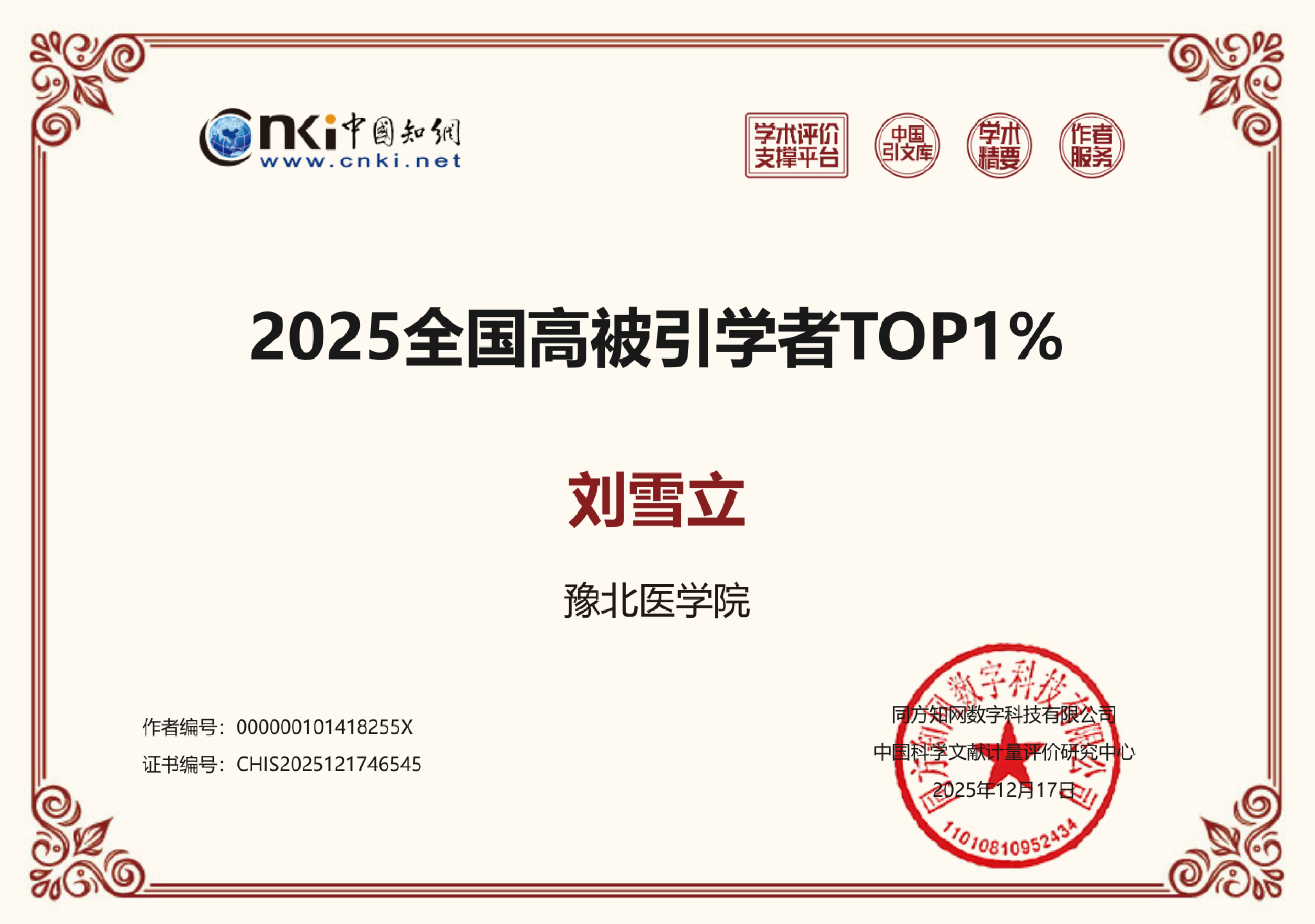 近日,从中国知网学术评价支撑平台获悉,我校图书馆馆长刘雪立教授入选中国知网信息资源管理(原图书情报与档案管理)学科2025年全国高被引学者Top1%。这是刘雪立连续两年入选全国高被引学者Top1%。 “中国知网高被引学者”是中国科学文献计量评价研究中心于2024年首次开展的学术影响力评价活动。该活动基于近十年国内学术成果,通过论文引证标准化指数(PCSI)量化学者学术影响力,遴选出总PCSI排名前1%和5%的高被引学者。入选学者需满足近十年发文的作者总PCSI位于初选作者范围的TOP1%~TOP5%,且近十年发表PCSI高于理论平均值(1.65)的论文不少于5篇以及近十年至少发表1篇高影响力论文。活动旨在客观表彰国内科研成果丰富、学术影响力突出的学者群体。 刘雪立教授的入选,不仅是对其个人学术成就的高度肯定,更是对我校高层次人才培养体系与科研创新生态的有力印证。这将进一步激励全校师生投身科学研究,持续产出具有重要影响力的科研成果,提升学校的学术声誉和整体竞争力,为学校教育事业高质量发展做出更大贡献。 刘雪立学术成就简介: 共发表中、英文论文220篇,其中SCI、SSCI和A&HCI收录20篇,CSSCI收录131篇。截止2025年12月27日,论文总被引频次3604次,下载量83136次。主持国家社会科学基金项目3项,省级科研项目6项。获河南省社会科学优秀成果奖2项,河南省高等学校哲学社会科学优秀成果奖9项。入选河南省优秀研究生指导教师、河南省高校哲学社会科学优秀学者、河南省师德先进个人(河南省教育奖章)、河南省期刊界优秀领军人物。学术兼职:中国科学技术期刊编辑学会常务理事、学术委员会副主任,河南省科技期刊学会理事长,中国科学学与科技政策研究会科学计量学与信息计量学专业委员会委员,《中国科技期刊研究》编委,《编辑学报》编委,《图书情报工作》《中国科技论坛》《数字图书馆论坛》《科学观察》《Journal of Informetrics》《PLoS ONE》等期刊审稿人。