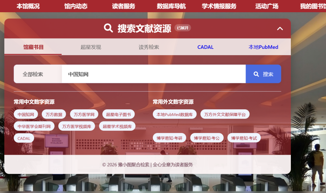 学校各单位: 为方便我校师生在寒假期间便捷使用中国知网数据库资源,图书馆联合信息化管理中心,已完成与中国教育科研计算机网统一认证与资源共享基础设施(CARSI)的对接工作,正式开通基于CARSI的中国知网校外访问权限。现将具体使用方式公告如下: 访问途径:登录CNKI校外访问系统 1.访问豫北医学院图书馆网站,点击“中国知网”栏目下的“https://fsso.cnki.net/(【校外访问】)”,或者在浏览器中直接输入网址https://fsso.cnki.net/,进入中国知网校外访问系统界面。