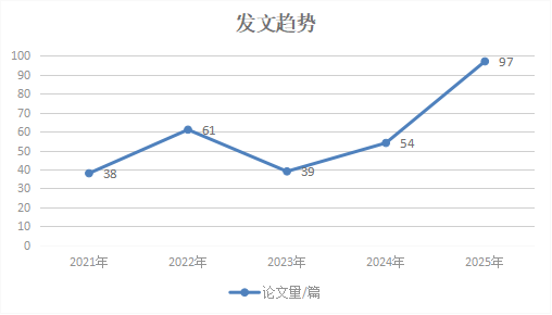 2025年为我校成功转设豫北医学院的第一年,为全面总结我校2025年度科研论文产出情况,客观评估我校科研产出力与学术影响力,图书馆基于本年度发表论文数据,对全校2025年科研论文产出情况进行统计分析,报告如下。 2025年度我校SCI论文产出实现百篇突破,全校教师共发表相关研究成果105篇,其中8篇为网络优先出版,按统计规则归至前一年度,本年度实际被SCI数据库收录97篇。学科分布:主要涵盖生物化学与分子生物学、化学、药理学与药剂学、护理学、医学影像学、口腔医学、公共卫生等多个专业领域及前沿交叉方向。国际合作:我校与美国、马来西亚、日本、巴基斯坦、法国、菲律宾、苏格兰、泰国等8个国家开展学术合作,国际科研合作规模有限,合作广度与深度仍有较大提升空间。国内合作:呈现 “省内核心集聚、国内广泛联动” 的特点,以河南省内高校为主要合作对象,与河南医药大学(58篇)、郑州大学(16篇)合作成果最为突出,构成核心合作伙伴,同时与国内多所高校、科研院所及医疗机构建立合作关系,合作网络持续完善。学术贡献:我校以第一作者或通讯作者发表SCI论文51篇,科研主导能力稳步增强,充分体现了教师的科研引领能力与扎实的学术素养;以参与作者合作发表46篇,彰显了开放协作的科研理念,为我校科研事业高质量发展提供了有力支撑。 97篇论文中,IF最高为20.3(来源期刊:Bioactive Materials,中科院一区,Top期刊)。IF ≥ 5.0的论文共计26篇,占比26.8%,包括发表于Bioactive Materials(IF=20.3)、Advanced Science(IF=14.1,中科院一区,Top期刊)、Journal of Nanobiotechnology(IF=12.6,中科院一区,Top期刊)等国际顶级期刊的论文,研究聚焦心肌梗死靶向治疗、乳腺癌多模态干预、天然药物抗肿瘤机制等前沿方向,兼具重要的学术价值和临床转化潜力;3.0≤ IF<5.0的论文共计33篇,占比34.0%,主要涉及帕金森病的发病机制、口腔微生物、疫苗开发、中药作用机制解析等领域;IF<3.0的论文共计38篇,占比39.2%,多为探索性基础研究与临床数据分析,为后续高水平研究积累了扎实基础。 Q1区论文46篇,占比47.4%,涵盖纳米药物递送、心肌梗死靶向治疗、基因工程等前沿领域,如发表于Bioactive Materials的内皮靶向细胞外囊泡心肌梗死治疗研究、发表于Journal of Nanobiotechnology代谢调控急性肾损伤水凝胶治疗研究等;Q2区论文28篇,占比28.9%,聚焦帕金森病发病机制、口腔微生物、中药作用机制等研究;Q3区论文14篇、Q4区论文9篇,合计占比23.7%,主要涉及肿瘤标志物筛选、炎症机制、药物合成优化等基础研究领域。 (一)整体概况 2025年度我校教师在中文期刊共发表论文281篇,研究领域广泛覆盖基础医学、临床医学、药学、护理学、公共卫生、医学教育、生命科学、口腔医学、智能医学工程以及人文社科等领域,形成了以医学领域为主体、交叉学科为延伸、教学研究相融合的多元产出格局,充分体现了不同学科科研人员的积极性与研究特色。其中,我校署名第一或通讯作者机构发表论文230篇,与其他机构合作发表论文51篇。 (二)核心期刊发文情况 核心期刊上共发表论文54篇,占比19.2%,涉及《中华预防医学杂志》《中国修复重建外科杂志》《中国药理学通报》《中华老年心脑血管病杂志》《动物学杂志》等权威核心期刊,研究领域覆盖临床医学、基础医学、药学、医学教育、护理学及生命科学等多个方向。 (一)SCI期刊论文 2021至2025年间,我校SCI论文发表量呈现波动上升的态势。2021年为38篇,2022年增长至61篇,2023年小幅回落至39篇,2024年回升至54篇。2025年,我校SCI论文发表量急剧攀升至97篇,较2024年增长79.6%,较2021年增长155.3%,呈现跨越式突破的良好势头。与此同时,2025年高影响力成果同步增加,实现“数量增长”与“质量提升”的双重突破。