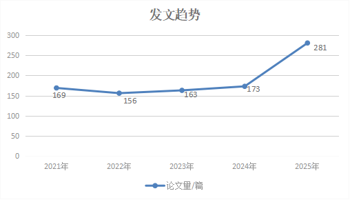 图1 2021—2025年我校SCI期刊论文发文趋势 (二)中文期刊论文 2021至2025年间,我校中文论文发表量呈现“先稳后升”的态势。2021年为169篇,2022年156篇,2023年163篇,2024年173篇,体现出持续、稳健的科研产出能力。2025年中文论文总量大幅跃升至281篇,较2024年增长62.4%,较2021年增长66.3%,实现历史性突破,创近五年新高。与此同时,核心期刊论文占比进一步提升,展现了我校国内科研成果在“量质齐升”的良好态势。